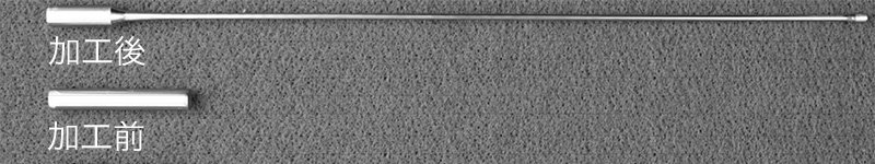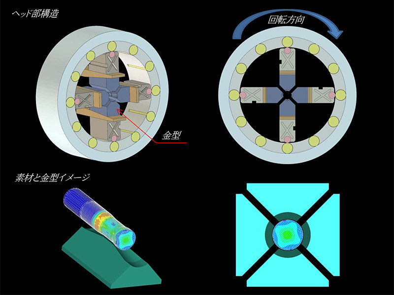 分割された金型が回転し、叩きながら丸棒やパイプ材の外径を絞っていく冷間鍛造加工です。CNCにより径と長手方向の調整が容易でかつ、精度の高い加工を行うことができます。切粉が出ず、素材費の低減などの利点があります。